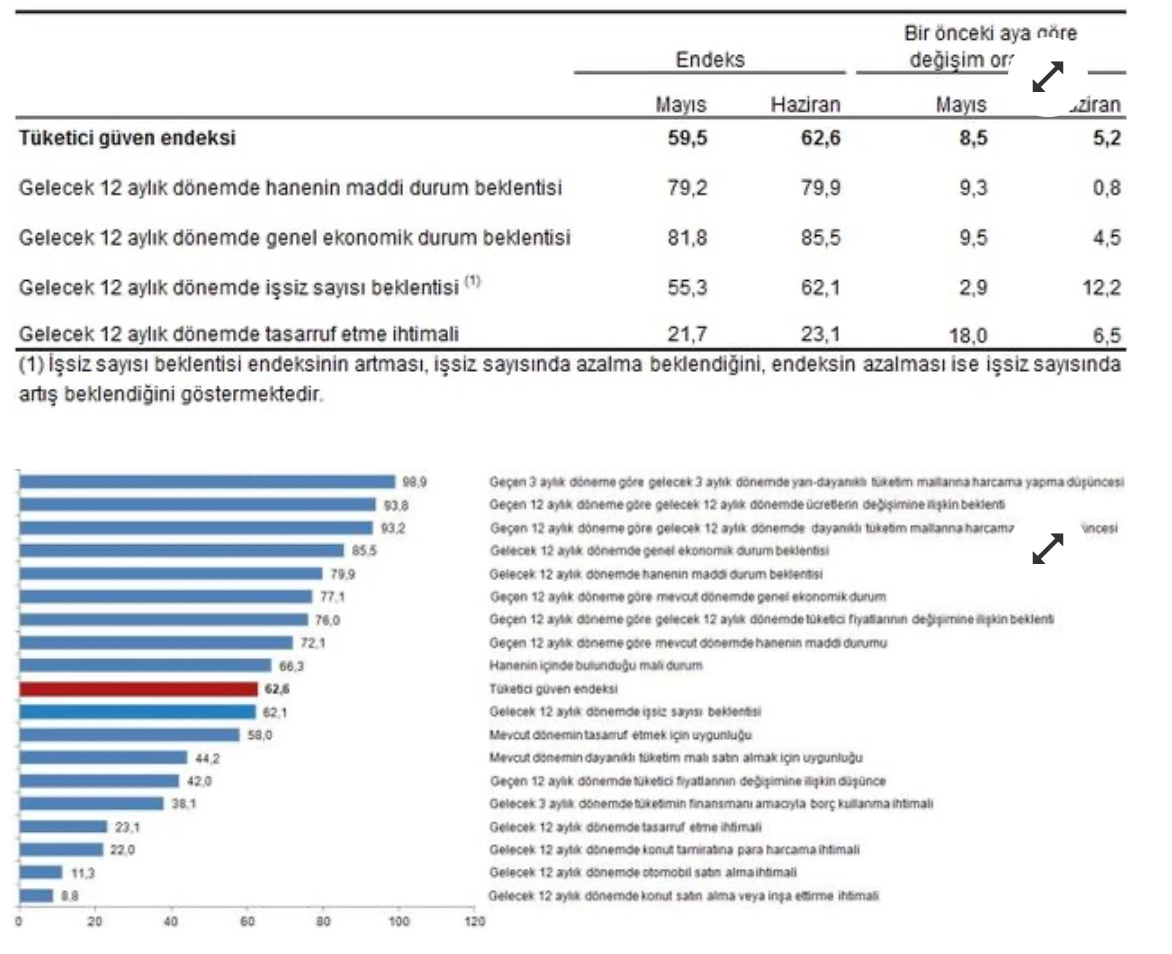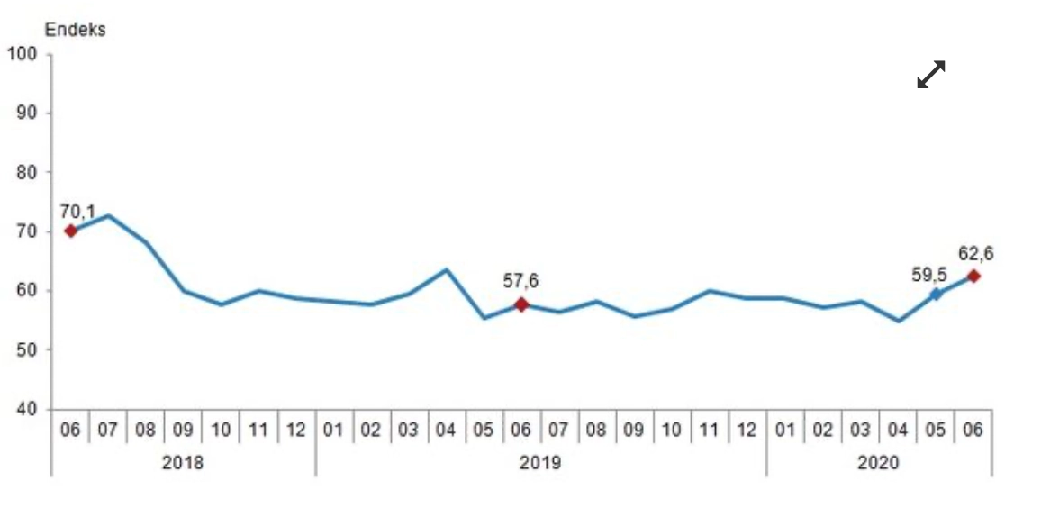 Türkiye İstatistik Kurumu ve Merkez Bankası işbirliği ile yürütülen tüketici eğilim anketi sonuçlarından hesaplanan mevsim etkilerinden arındırılmış tüketici güven endeksi, Haziran ayında bir önceki aya göre yüzde 5,2 oranında arttı; Mayıs ayında 59,5 olan endeks, Haziran ayında 62,6 oldu.